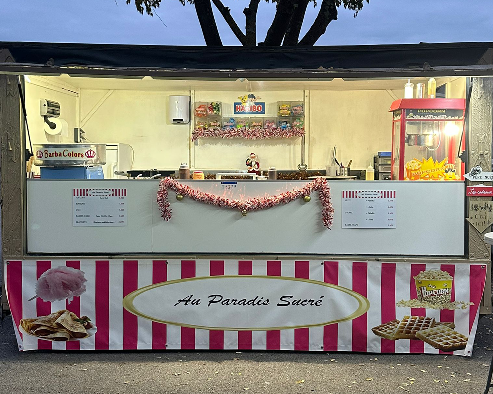 Apportez une touche chaleureuse et gourmande à vos événements avec notre chalet à confiseries. Idéal pour les marchés de Noël, fêtes de fin d’année ou animations en extérieur, ce stand au style authentique propose bonbons, barbe à papa, pop-corn et autres douceurs dans un décor accueillant.